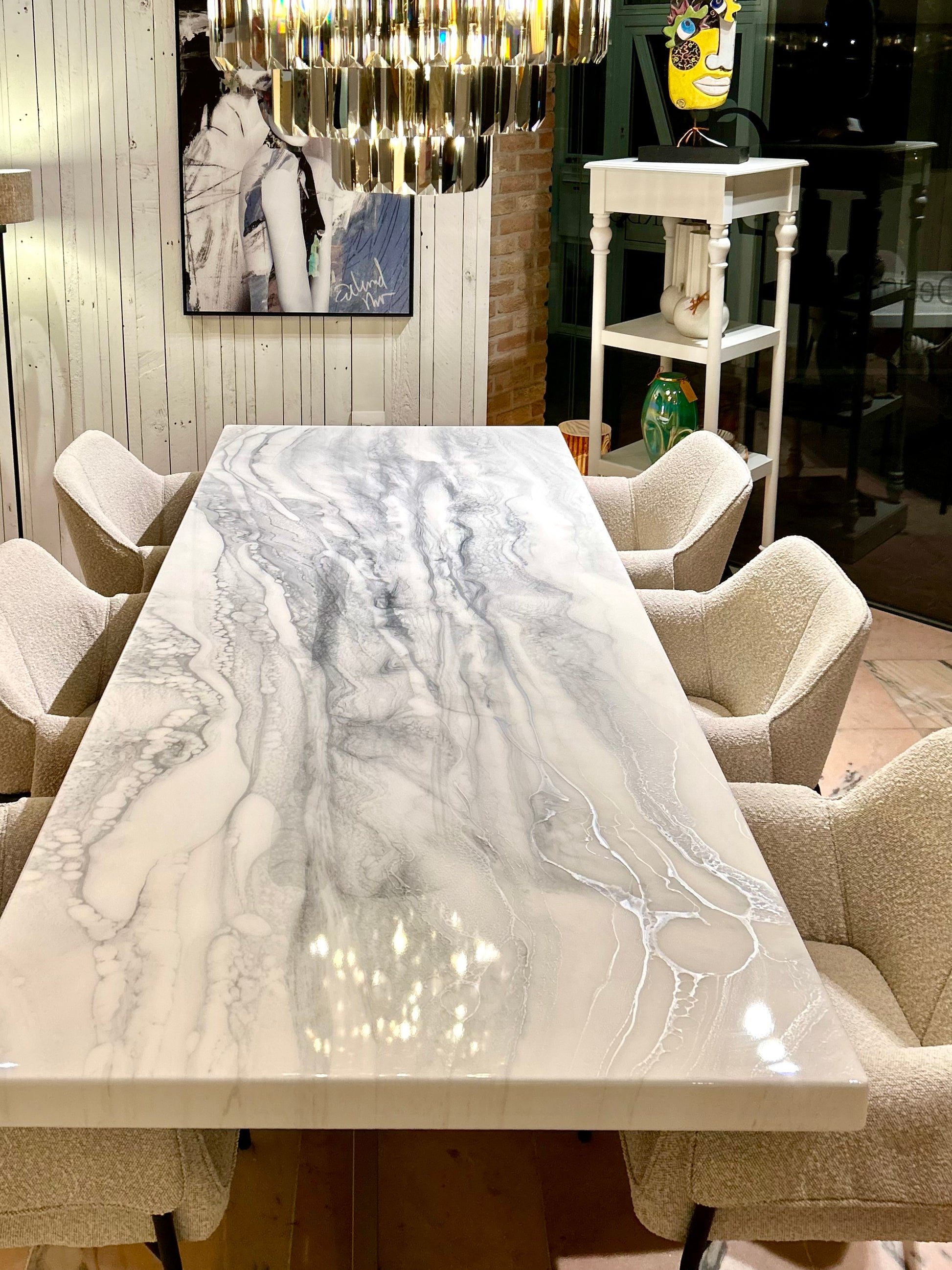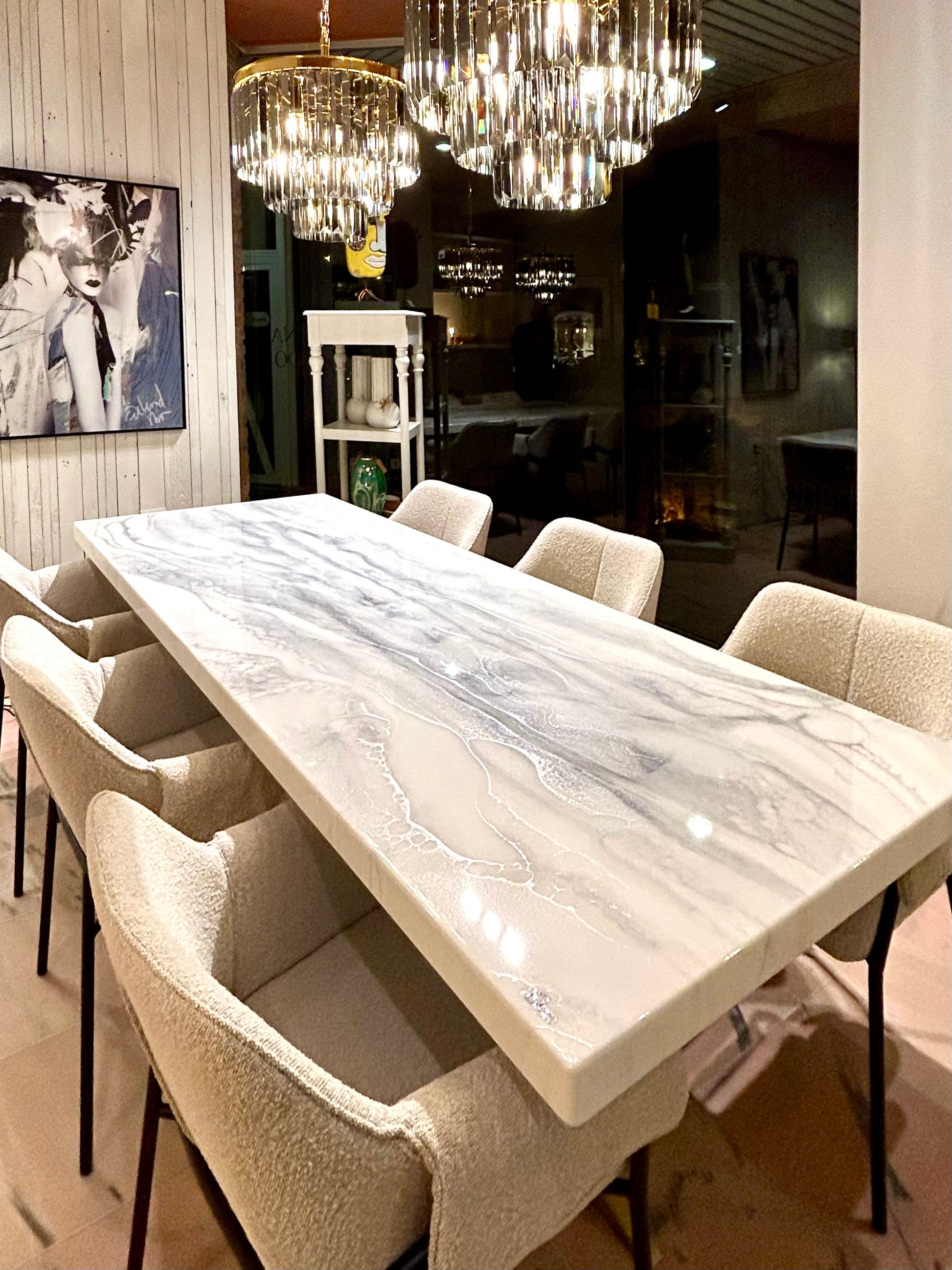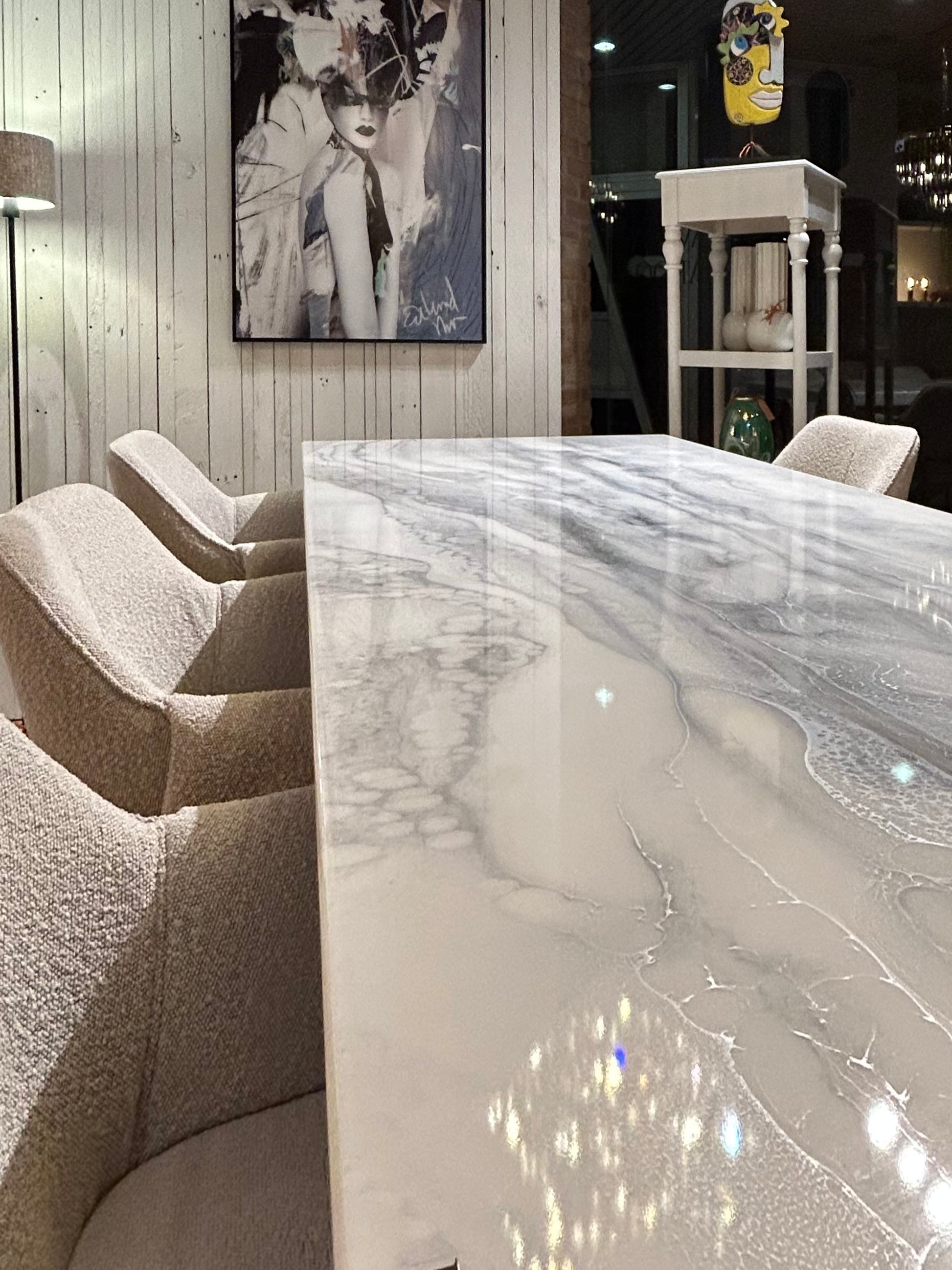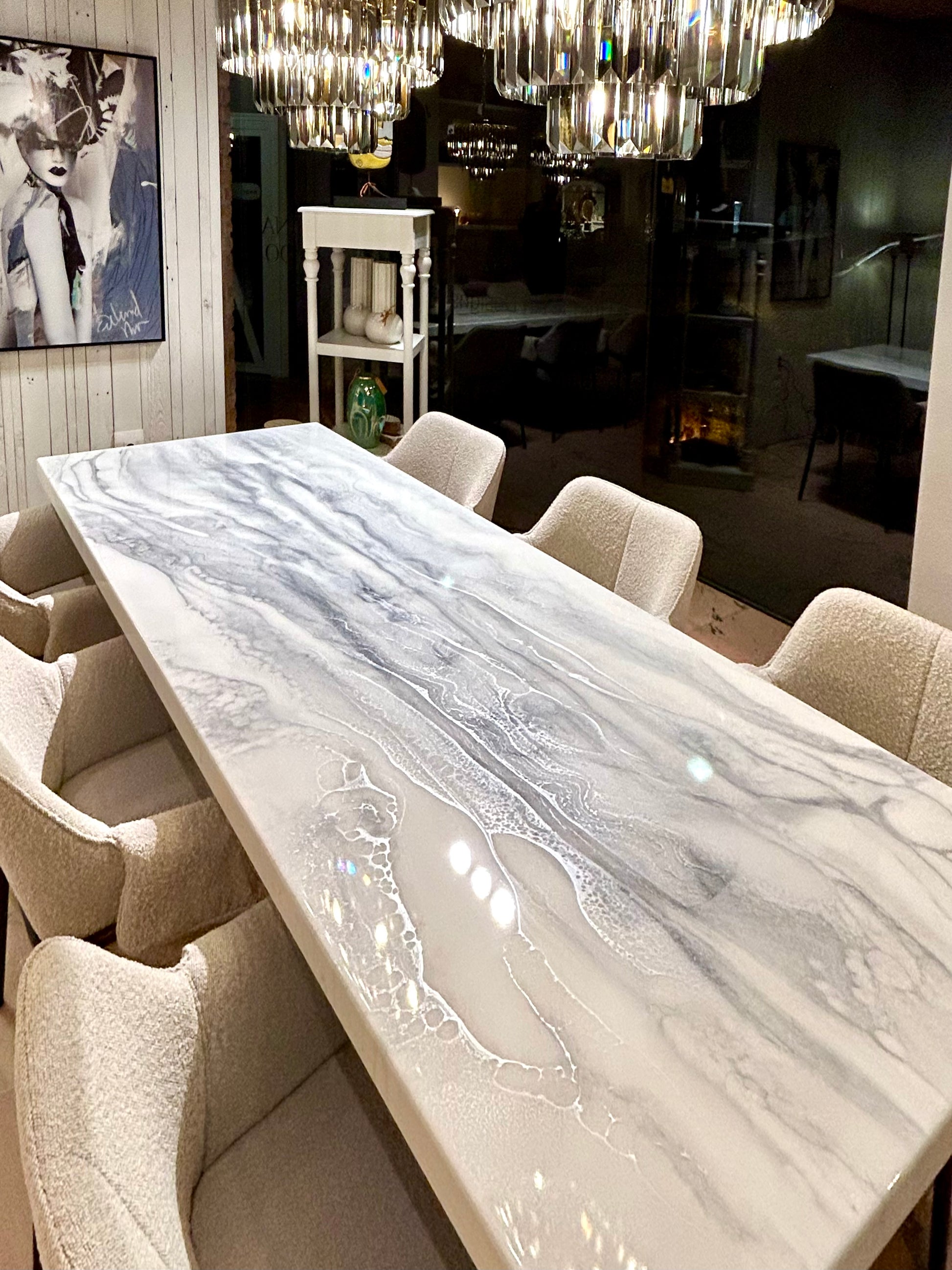 Werten Sie Ihren Essbereich mit einem einzigartigen Esstisch auf, der exklusiv für Sie handgefertigt wird. Jeder Tisch ist eine Einzelanfertigung, sodass kein Stück dem anderen gleicht. Mithilfe spezieller Techniken kreiere ich atemberaubende Marmordesigns, und dieser Tisch besticht durch seine wunderschöne Marmorplatte.