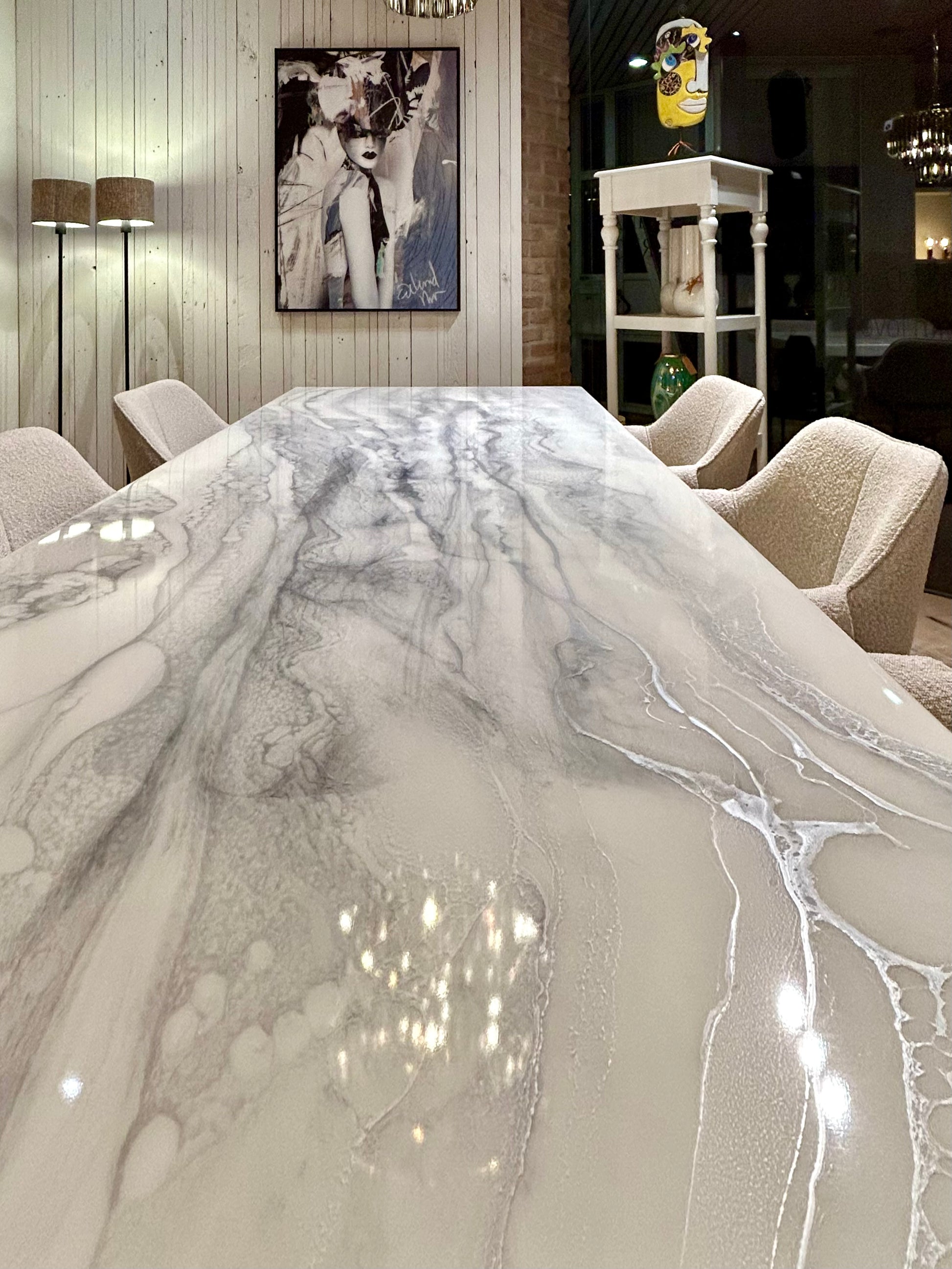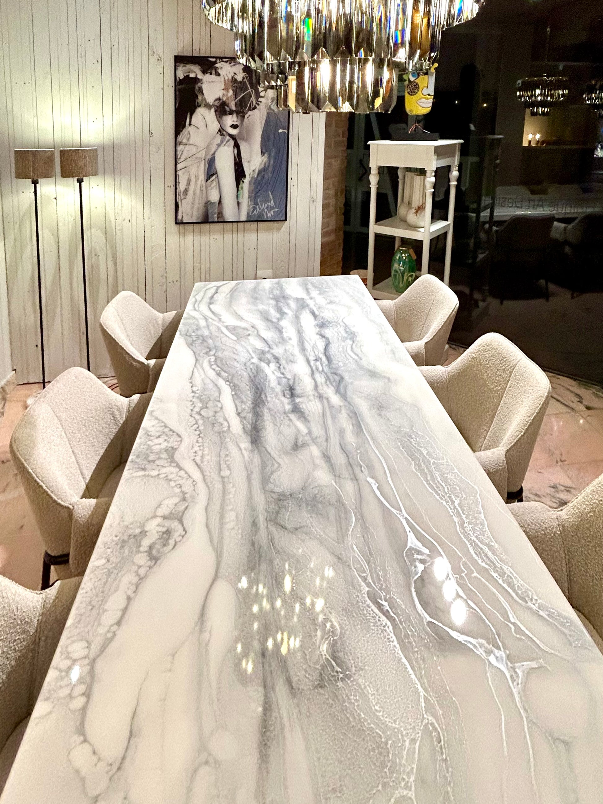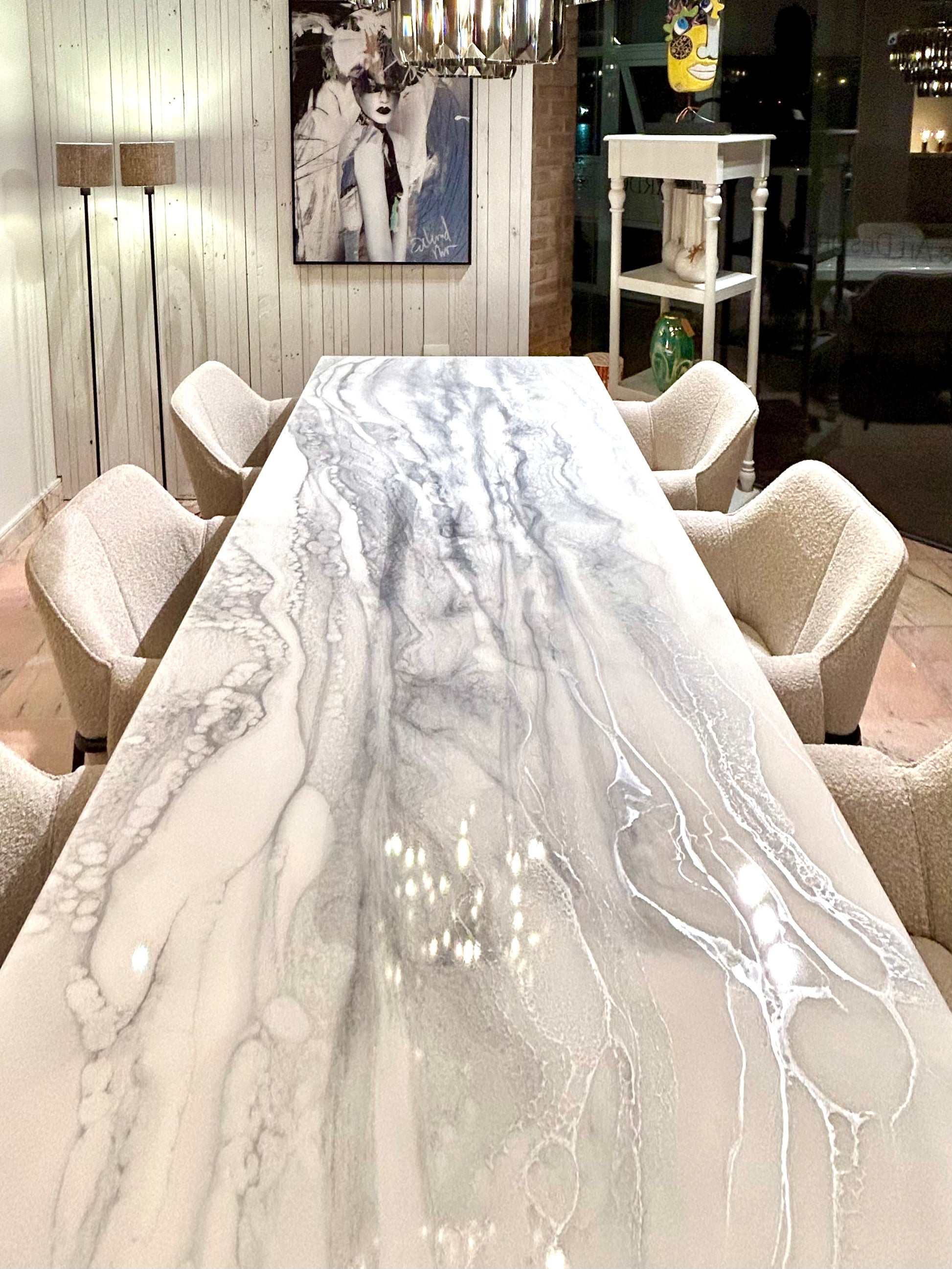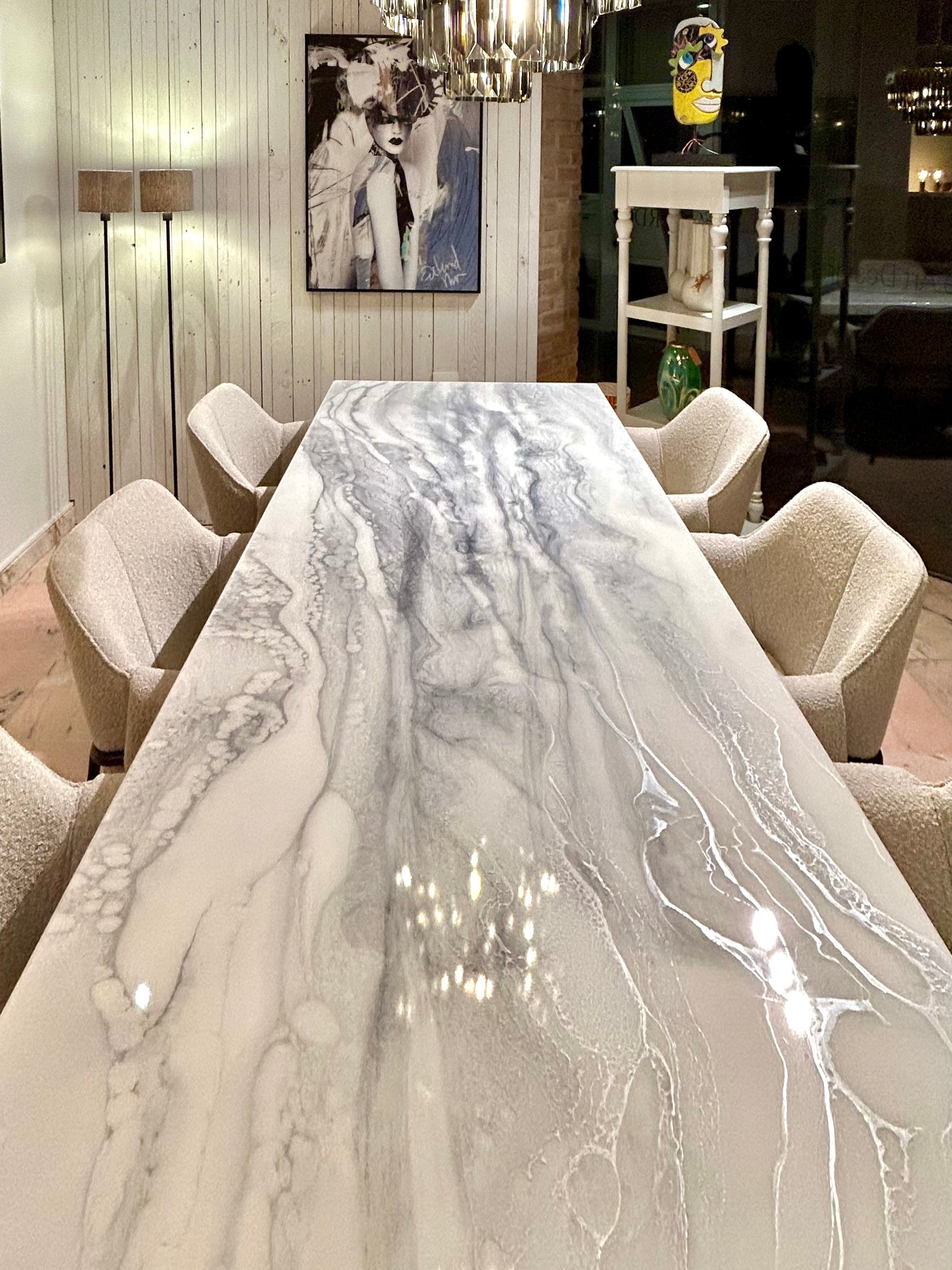 Werten Sie Ihren Essbereich mit einem einzigartigen Esstisch auf, der exklusiv für Sie handgefertigt wird. Jeder Tisch ist eine Einzelanfertigung, sodass kein Stück dem anderen gleicht. Mithilfe spezieller Techniken kreiere ich atemberaubende Marmordesigns, und dieser Tisch besticht durch seine wunderschöne Marmorplatte.