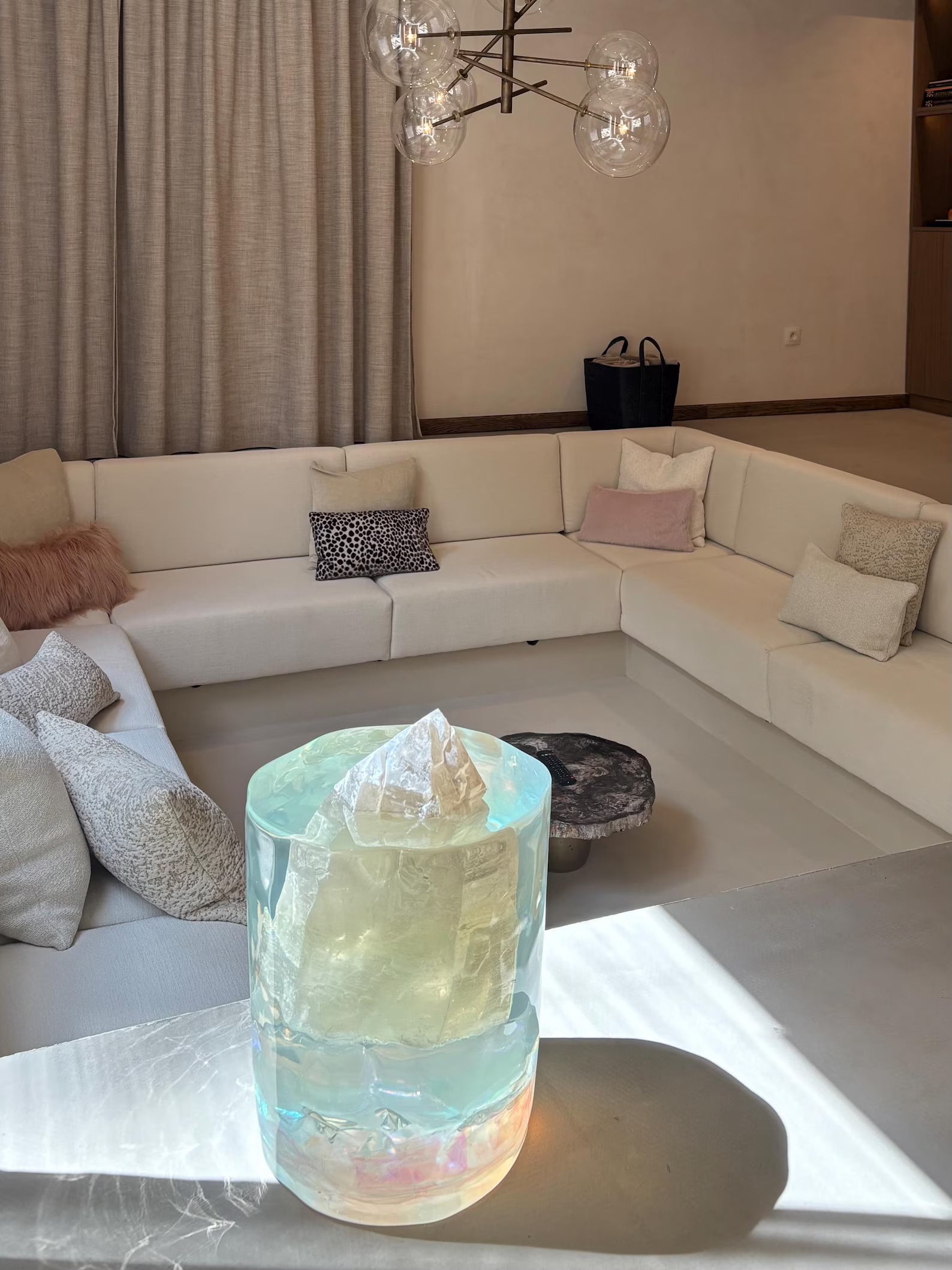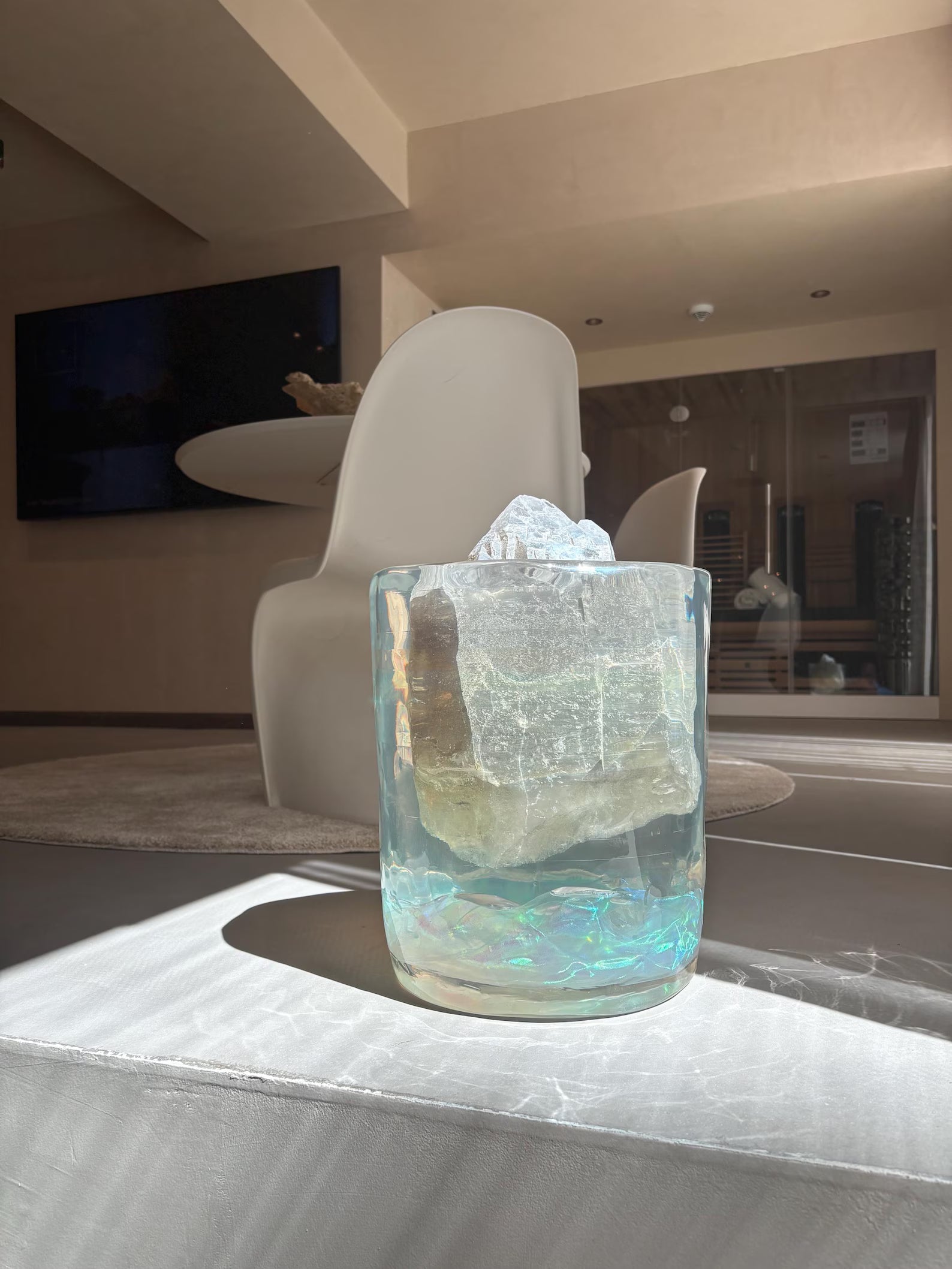 „Levitate“ präsentiert einen faszinierenden, 12,1 kg schweren Quarzkristall, der über einem formschönen Sockel aus hochwertigem Epoxidharz zu schweben scheint. Dieses einzigartige Kunstwerk stellt die natürliche Schönheit des Edelsteins eindrucksvoll zur Geltung und fängt das Licht ein, um die faszinierenden Geschichten unserer Naturwelt zu erhellen. Das durchdachte Design ermöglicht es, dass das Licht auf vielfältige Weise von der Skulptur reflektiert wird und je nach Blickwinkel unterschiedliche Farbschattierungen offenbart. Das Kunstwerk erinnert an die Schönheit der Natur und die Kunstfertigkeit des menschlichen Geistes.