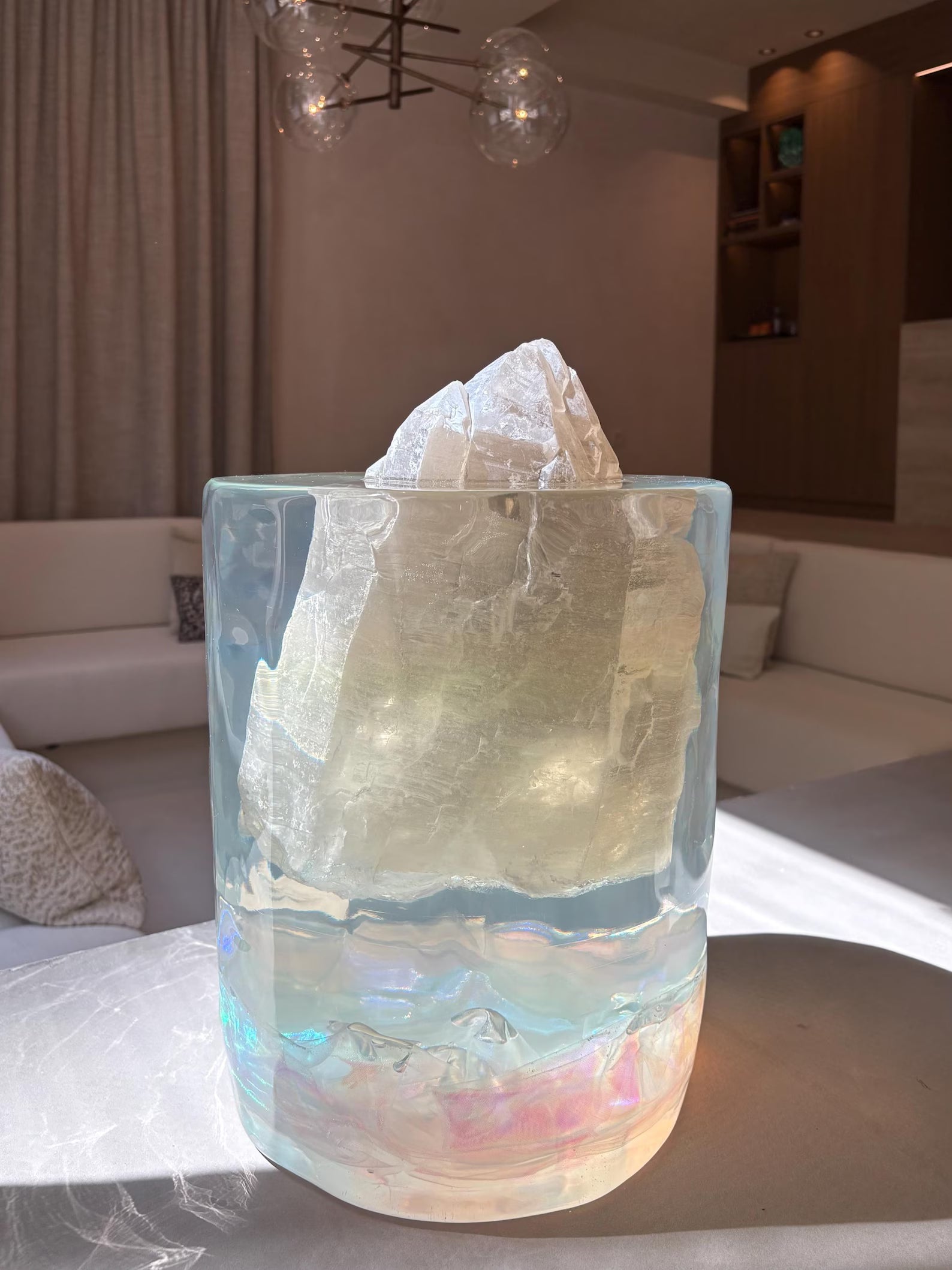 - **Natürliche Eleganz:** Der schwebende Kristall stellt seine natürliche Schönheit zur Schau, während die glatte Oberfläche des Epoxidharzes jedem Raum Wärme und Ruhe verleiht.