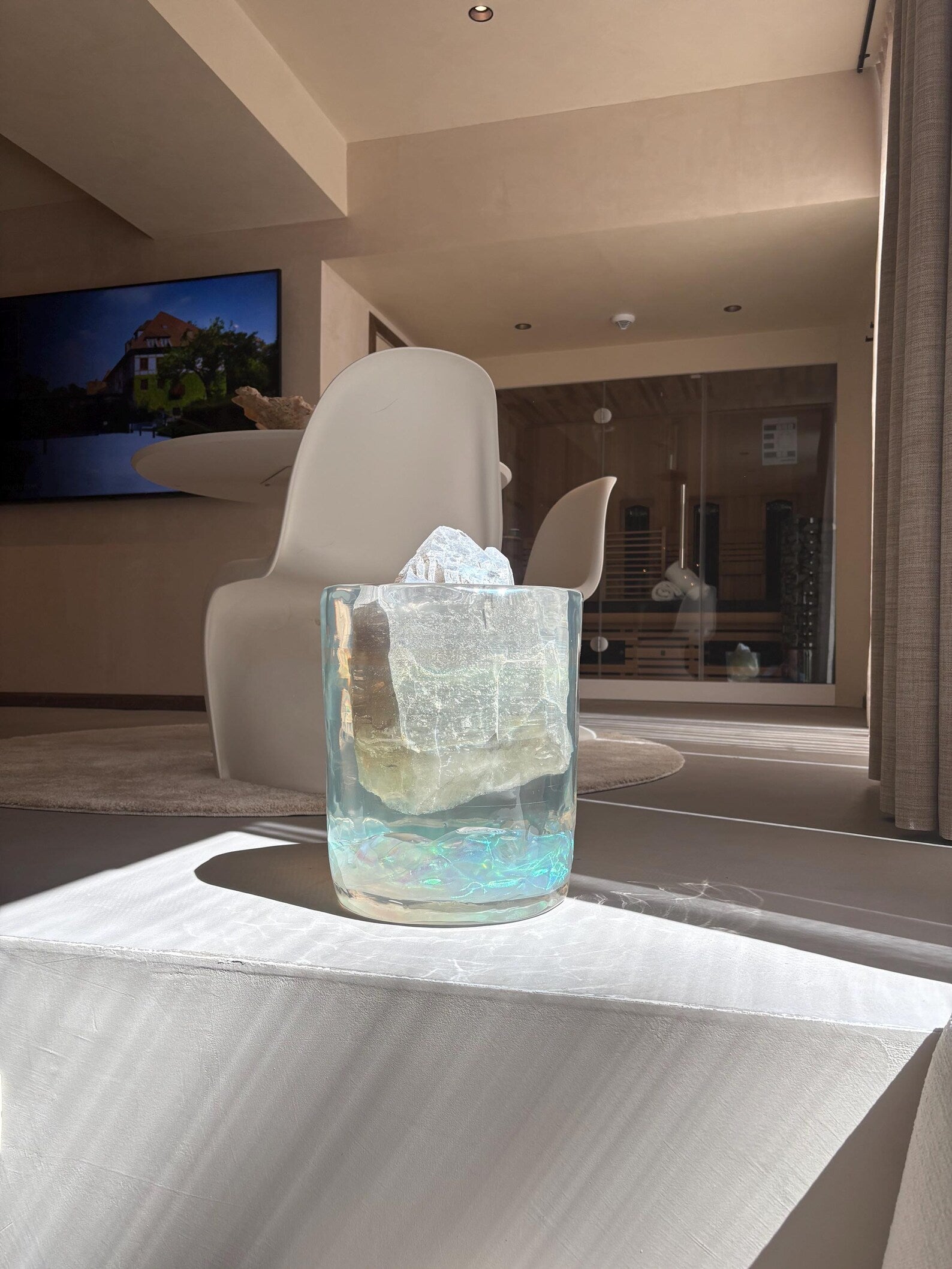 - **Material:** Hergestellt aus hochwertigem Epoxidharz und einem markanten Quarzkristall, der fachmännisch eingesetzt wurde, um seine Klarheit und Leuchtkraft zu erhöhen.