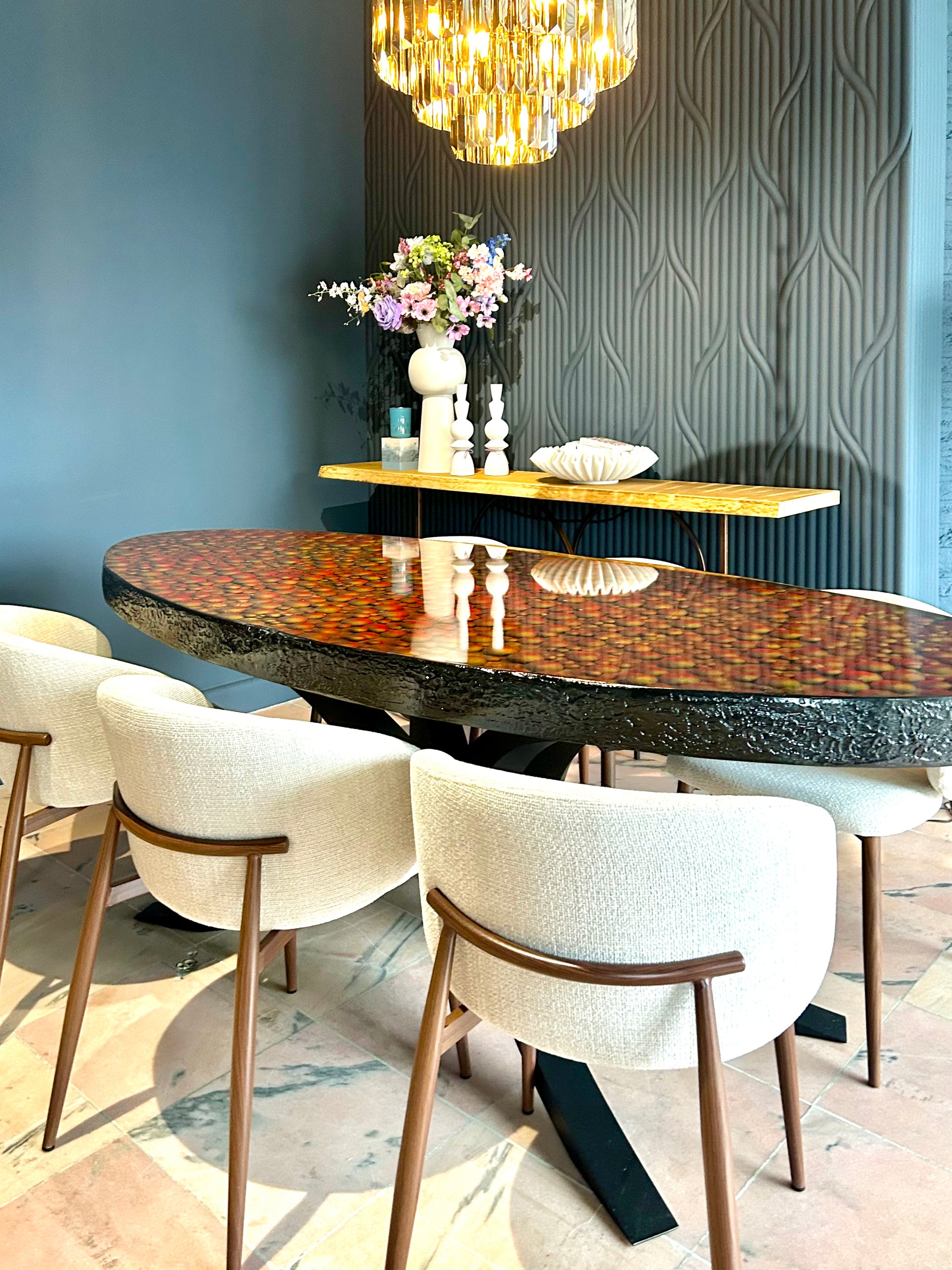 • Beyond Tables: To complete your interior, we also create matching artworks and custom dressers in the same signature style.