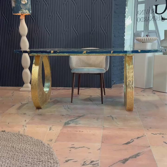 La table Galaxy est une pièce maîtresse sur mesure, conçue par Leonardo Gravina. Son plateau en résine bleue transparente, parsemé de paillettes d'or scintillantes et de délicates incrustations de nacre, capture la beauté du cosmos dans une forme fonctionnelle. Chaque pièce est unique, fabriquée artisanalement avec un souci du détail exceptionnel et conçue pour sublimer tout espace de vie.